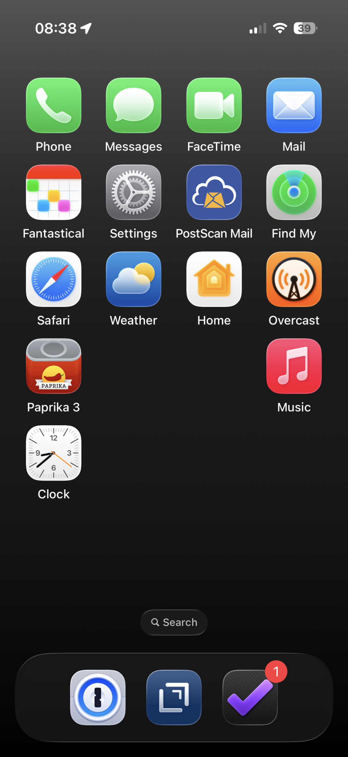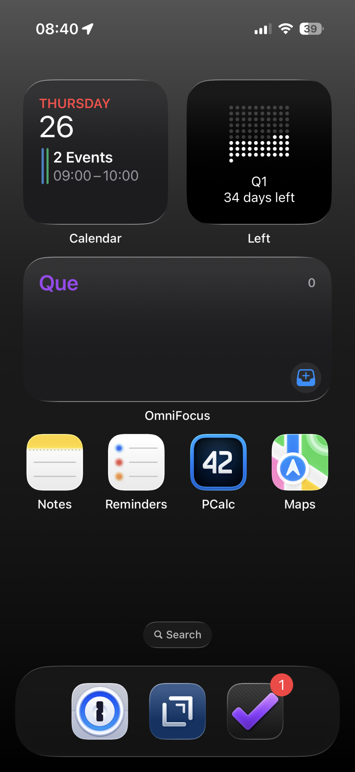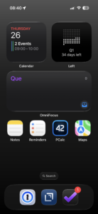 Just the stock black background that has a slight gradient from dark gray to black. It’s boring and simple, but I like it. I’ve also removed most of the icons from my home screen. I use the Calendar and OmniFocus widgets to keep tabs on what’s going on. I also use the Left widget to graphically show the days remaining in the current quarter. Only a handful of apps live on my home screen. Notes, Reminders, PCalc, 1Password, Drafts, OmniFocus, and Maps. The Phone, Messages, FaceTime, and Mail applications live on the second page, along with a short list of other key applications. Slowly, I’ve been removing the other applications from the remaining screens, since searching for them works fine when I need them.